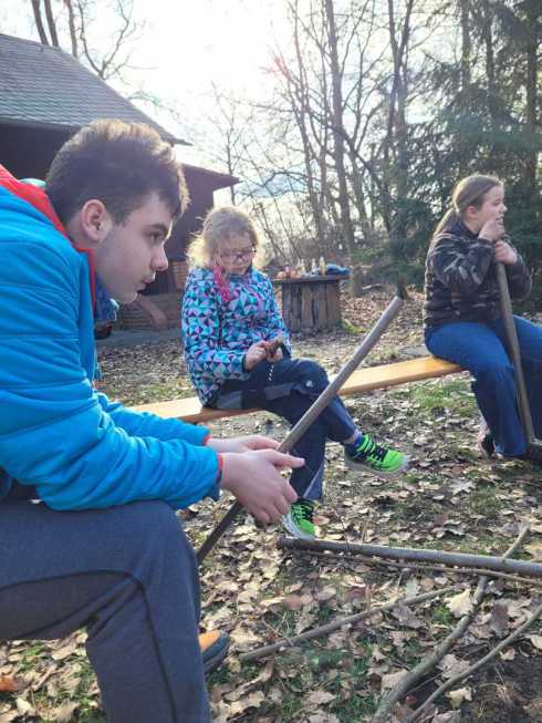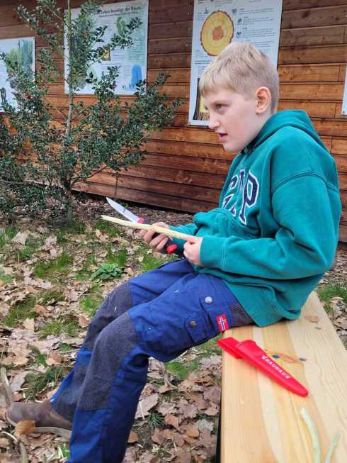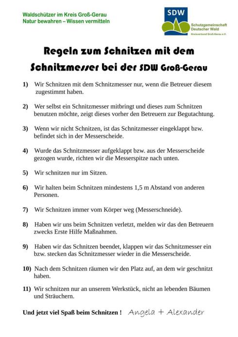 Beim sich anschließenden Schnitzdiplom wurden zunächst die Schnitzregeln von den Waldfüchsen abwechselnd laut vorgelesen und in der Gruppe besprochen. Durch das Schnitzen von Ästen vom Haselnussstrauch wurden diese danach gleich in die Praxis umgesetzt. Alle Waldfüchse machten gut mit und wiesen sich gegenseitig auf die Schnitzregeln hin, sodass alle anwesenden Waldfüchse das Schnitzdiplom der SDW-GG verliehen bekommen.